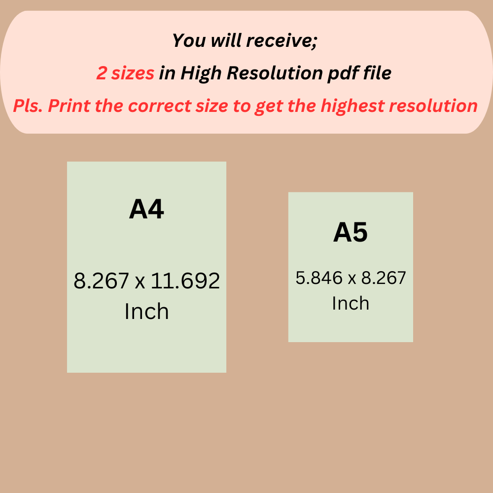 You will receive 4 PDF files for print in 2 different sizes (A4 & A5); You can print as many times as you like