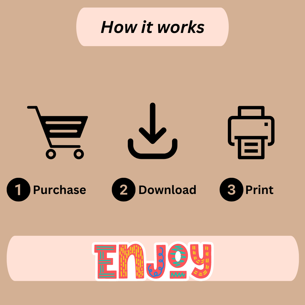 You will receive 6 PDF files for print in 2 different sizes (A4 & A5). You can print as many times as you like