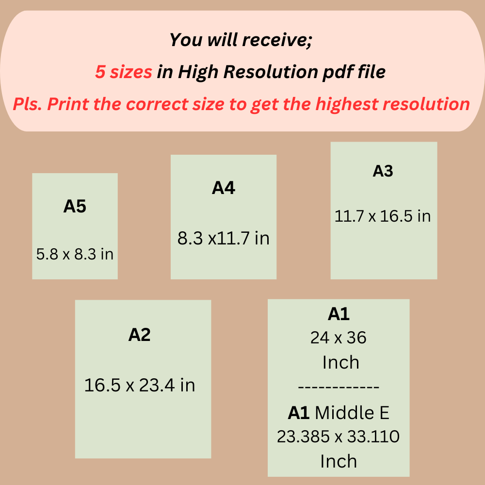 You will receive 6 sizes in High resolution PDF file. Pls. print the correct size to get the highest resolution.